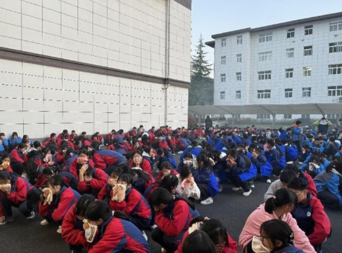 18时00分,伴随着烟雾弹的滚滚浓烟和急切的警报声,应急广播响起:“全体住校生请注意!现在是火灾警报。请大家不要慌乱,听从指挥,请迅速捂上湿毛巾,在寝室长的带领下有序撤离……”住校生们忙而不乱,用湿毛巾捂口鼻,弯腰,抱头,迅速、有序撤离。