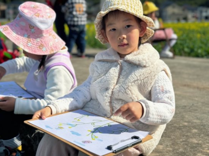 在“探·油菜花”活动中,孩子们拿着“油菜花研学卡”仔细观察、探究油菜花的气味、颜色、花蕊、花萼,在体验探究的过程中发展了幼儿初步的探究能力;在“玩·油菜花”活动中,孩子们在油菜花丛中玩游戏、读绘本、念诗歌,感受春天的美好;在“留·油菜花”活动中,孩子们用手中的画笔描绘着眼前美丽的油菜花,用他们的视角记录着这片油菜花花海,有的还添上白云,阳光,蓝天、好朋友、蜜蜂、蝴蝶等,用自己的方式记录下了这美好的瞬间!