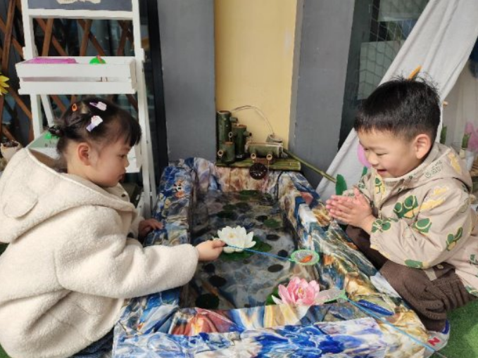 强烈的好奇心会引发他们积极去观察和探索。你看,孩子们在午后就在饲养区玩起了捞鱼小队的游戏呢。宝贝们嘴巴里念念有词,小身体扭来扭去,小脚丫蹦来跳去……哇,好开心啊!“哇,我抓到啦!
