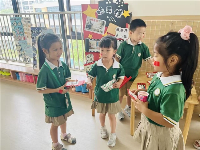 电影放映前,互动环节格外热闹。“电影代言人” 们一会儿叉着腰模仿潘冬子的模样,一会儿脆生生念着 “鸡毛信不能丢” 的台词,逗得大家哈哈大笑;“萌娃检票员” 则佩戴着自制工作证,认真地接过小伙伴的电影票,笑着指引:“可以进去啦,快找你的小座位!” 那模样,活脱脱一副 “小主人” 的架势。随后,孩子们攥着自制的电影票,排着整齐的队伍入场,小眼睛里满是期待。