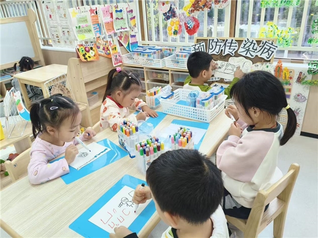 活动现场,教师通过视频、图片和实例,以通俗易懂的方式,向幼儿介绍了流感、手足口病、疱疹性咽颊炎等常见秋季传染病的症状、危害及预防措施;紧接着,还学习了有趣的《预防秋季传染病》拍手歌,“你拍一,我拍一,勤洗澡来勤换衣;你拍二,我拍二,开窗通风好习惯……”一首首朗朗上口的拍手歌,让孩子们在轻松哼唱中牢记防护要点;最后,孩子们拿起小小画笔和老师一起绘制了有关预防秋季传染病的展板展示在幼儿园大厅内,向园内的其他小朋友、老师及家长展出,使得宣传的辐射面愈发广泛。