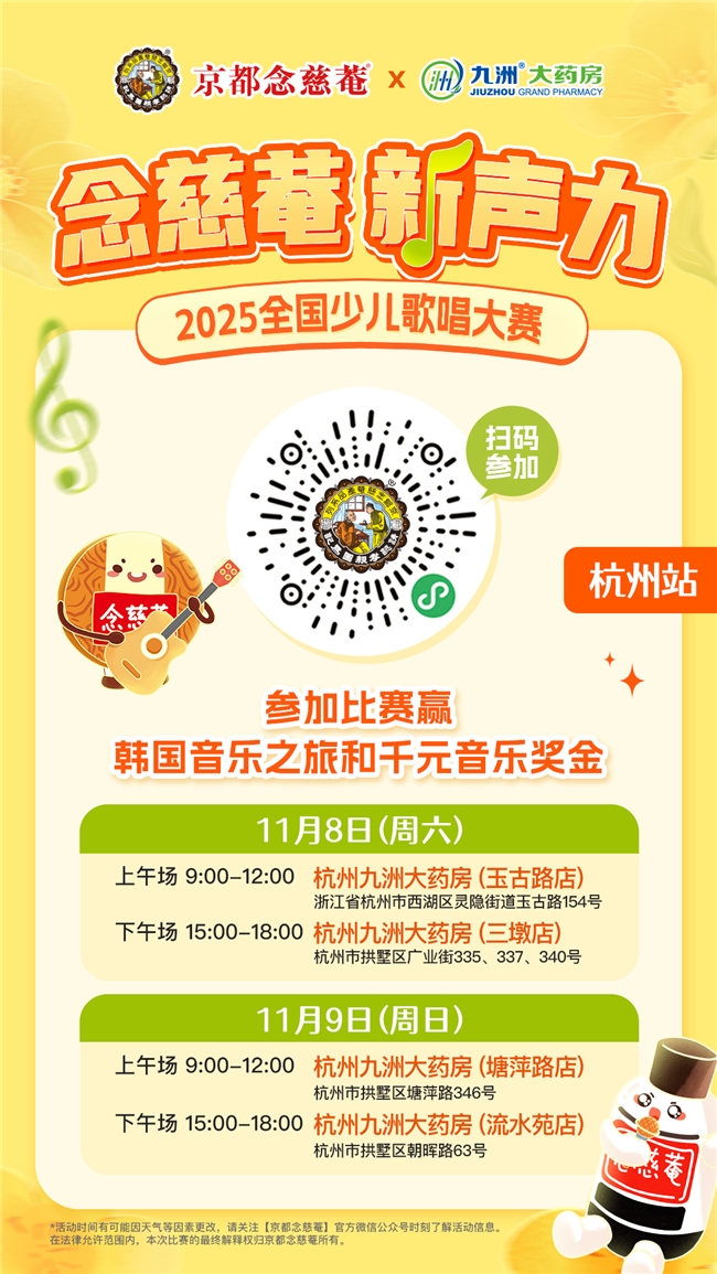 “念慈菴·新声力”全国少儿歌唱大赛可以通过线上和线下两种方式参与海选。线下海选覆盖全国 25 座城市,让热爱音乐的小朋友在家门口就能轻松圆梦!本次杭州站联合九洲大药房,我们把舞台搬到你的身边!无需提前预约,药店门口即可直接报名参赛,一展歌喉。家长拍摄孩子唱歌视频作品上传小程序,即视为成功参赛。勇敢站上舞台的每位小选手,都能获得京都念慈菴精心准备的定制礼品!我们更鼓励家长全程陪伴,用镜头定格孩子第一次登台的紧张与雀跃,让这场音乐之旅成为亲子共成长的珍贵回忆。