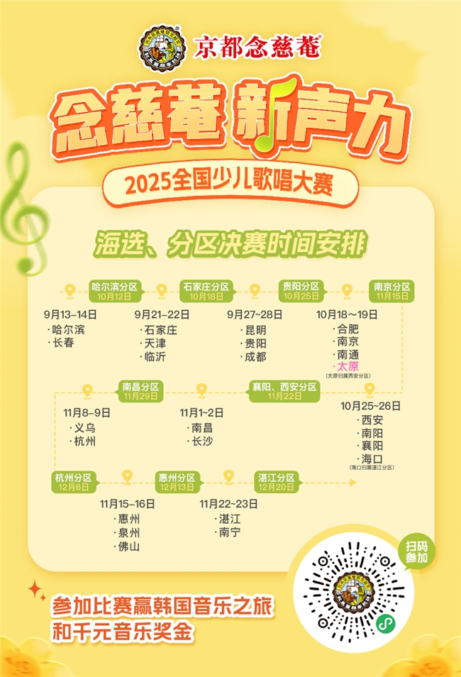承载百年护嗓匠心,唱响新时代好声音!百年品牌京都念慈菴再度启幕少儿音乐盛宴—— 第三届 “念慈菴・新声力” 全国少儿歌唱大赛将在2025年11月8日至9日来到杭州开展线下海选。每段旋律,都是童心深处的回响;每次登台,都是成长路上的熠熠星芒。我们期待每个热爱音乐的孩子们,都能在梦想的舞台上尽情绽放,一起唱响念慈菴好声音,唱响未来!