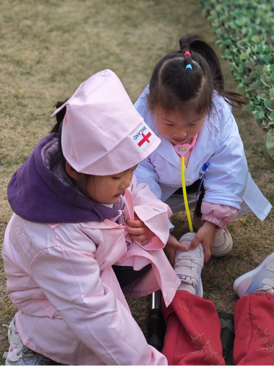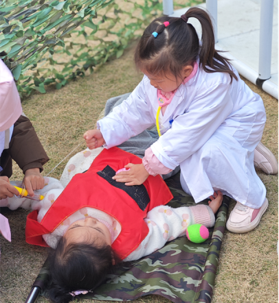 孩子们在野战区玩的不亦乐乎,但是在玩当中,孩子们也会有一点小摩擦,也会有一定的游戏难度的提升,在孩子们一次一次的商讨和试错中,孩子们明显有了更丰富的作战经验和更强的角色分配意识。搭建的形状多样,增设瞭望口、隐蔽点,不给敌人机会。经过N+1次的野战游戏,在游戏中,有“战友”受伤,“医生”立马进行抢救,队员积极协助,户外游戏真正的“游”你做主。