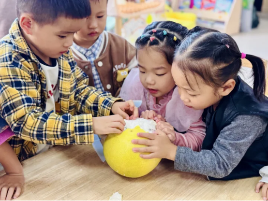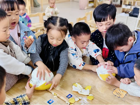 当看到果肉逐渐露出时,孩子们脸上满是兴奋与成就感。最终,速度快、剥得完整的西瓜组获得“剥柚小冠军”称号,所有参与的孩子都收获了属于自己的劳动成果——香甜的柚子果肉。