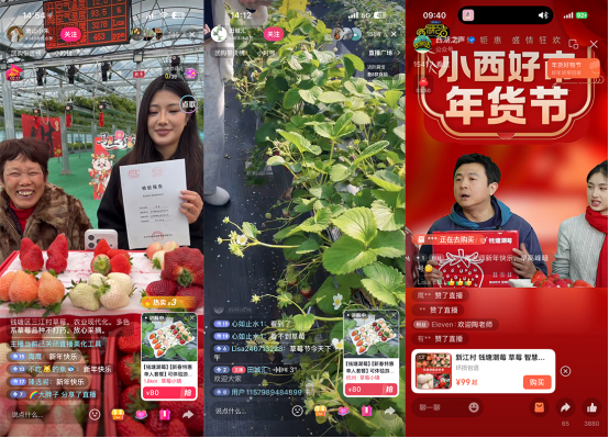 在“种得好更要卖得好”的理念驱动下,园区团队与罗贤飞深度对接,携手探索销售新路径。此外园区还对接社区团购渠道明康汇,并与新江村达成签约合作。借助线上线下活动以及直播电商、社区电商平台等活动全方位的曝光,让草莓、盆栽等农产品走进千家万户。同时,线上布局本地生活与电商平台,新开通抖音来客、美团“草莓小镇”本地采摘店铺,协助搭建并运营微信小程序“钱塘潮涌莓满新江”线上小店,实现农产品从田间地头到消费者手中的高效对接,让优质农产品不愁卖、卖得好。